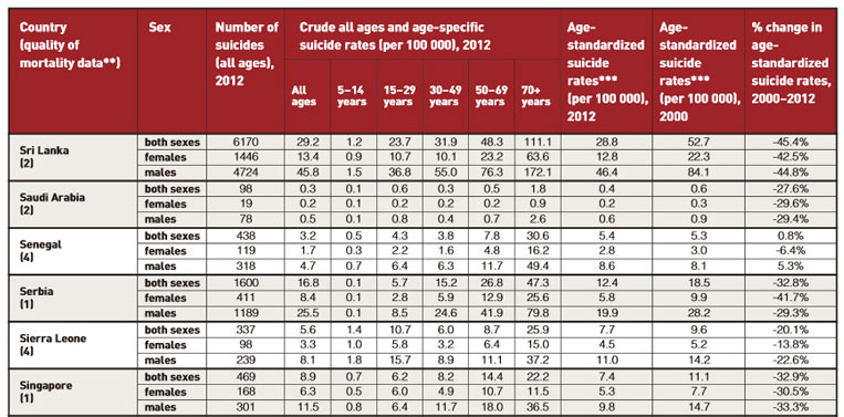 172 உலக நாடுகளைக் கொண்டு உலக சுகாதார நிறுவனம் மேற்கொண்ட ஆய்வில் அதிகம் தற்கொலைகள் இடம்பெறும் நாடுகள் தரவரிசையில் இலங்கைக்கு நான்காம் இடம் கிடைத்துள்ளது.
