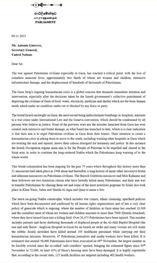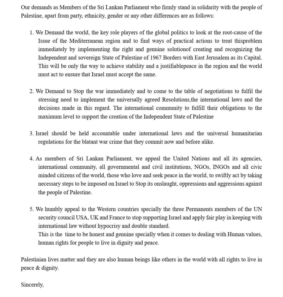 கட்சி, இனம், பாலினம் அல்லது வேறு ஏதேனும் வேறுபாடுகளுக்கு அப்பால், பாலஸ்தீன மக்களுடன் உறுதியாக நிற்கும் இலங்கை நாடாளுமன்ற உறுப்பினர்களாகிய எங்களது கோரிக்கைகள் பின்வருமாறு:
