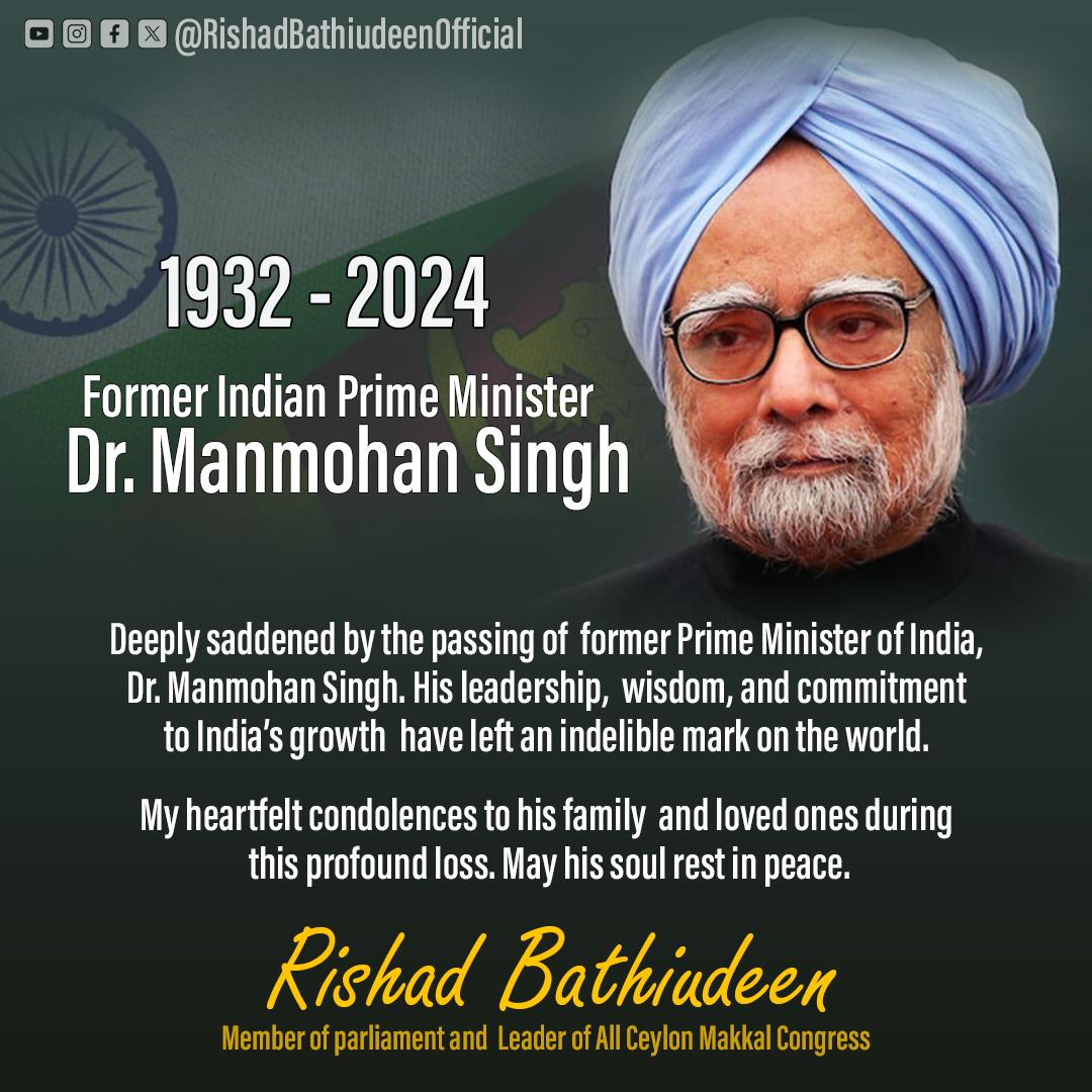 “இந்தியாவின் பொருளாதார வளர்ச்சியின் மூளையாக பிரகாசித்த கலாநிதி மன்மோகன் சிங், இலங்கையின் பல்துறை அபிவிருத்திக்கு கைகொடுத்த ஒருவர், அவரது இழப்பு கவலைக்குரியது” என்று அகில இலங்கை மக்கள் காங்கிரஸ் தலைவரும் பாராளுமன்ற உறுப்பினருமான ரிஷாட் பதியுதீன் தெரிவித்துள்ளார்.