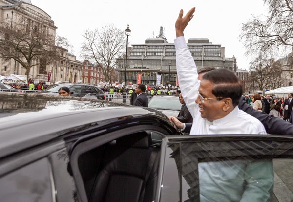 ஜனாதிபதி மைத்திரிபால சிறிசேனவின் லண்டன் விஜயத்துக்கு எதிர்ப்பு தெரிவித்து, நேற்று செவ்வாய்க்கிழமை ஆர்ப்பாட்டமொன்று முன்னெடுக்கப்பட்டது. இந்த ஆர்ப்பாட்டம் நடைபெற்ற இடத்துக்குச் சென்ற ஜனாதிபதி, ஆர்ப்பாட்டக்காரர்களுக்கு கையசைப்பதை படத்தில் காணலாம்.
