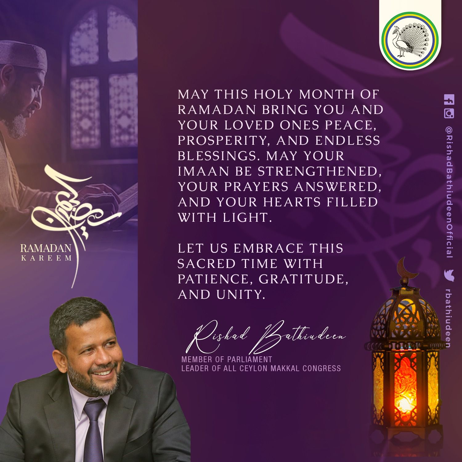 ரமழானின் அருட்கொடைகள் சகலருக்கும் கிடைப்பதுடன், நோன்பு கால அமல்களில் சிறப்பாக ஈடுபடுவதற்கு எல்லாம் வல்ல அல்லாஹ்! அருள்பாலிக்க பிரார்த்திப்பதாக அகில இலங்கை மக்கள் காங்கிரஸ் தலைவரும் பாராளுமன்ற உறுப்பினருமான ரிஷாட் பதியுதீன் தெரிவித்துள்ளார்.