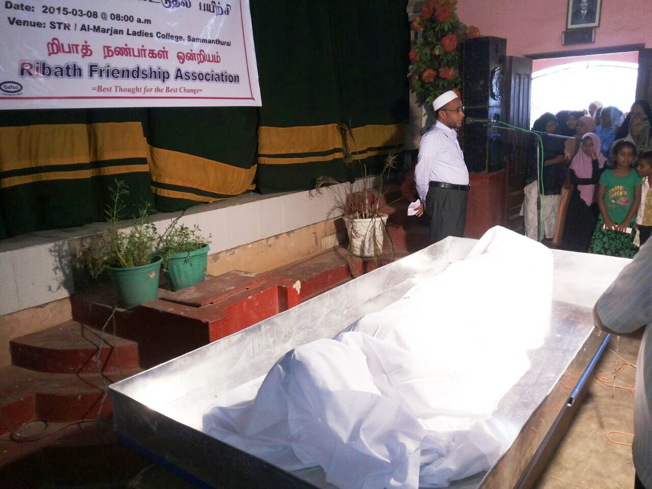 சம்மாந்துறையில் பல்வேறுபட்ட சமூக நலப்பணிகளை செய்து வரும் றிபாத் நண்பர்கள் ஒன்றிய சமூக சேவைகள் அமைப்பினரால் அண்மையில் (2015-03-08) சம்மாந்துறையில் பெண்களுக்கான ஜனாசா குளிப்பாட்டல் மற்றும் கபனிடுதல் பயிற்சிகள் வழங்கப்பட்டன.