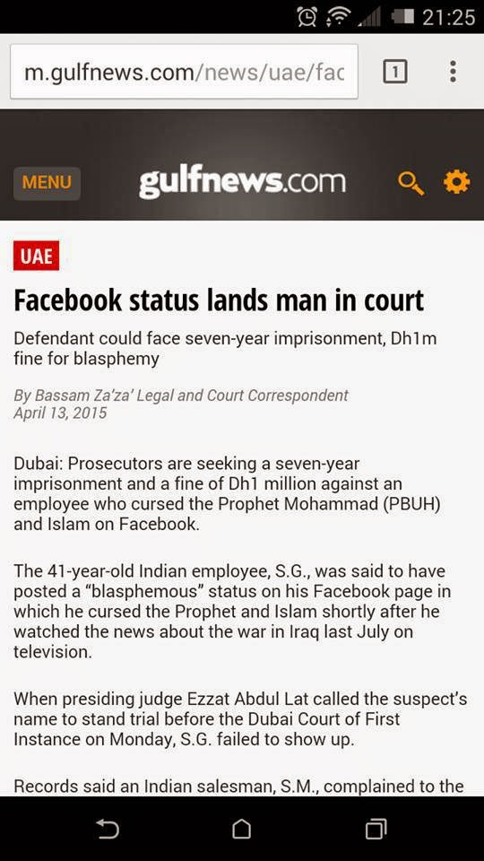 துபாயில் இருந்து கொண்டு இஸ்லாமிய மார்க்கத்தை இழிவு படுத்தும் விதத்தில் பேஸ்புக்கில் பதிவிட்ட இந்தியர் ஒருவரை அந்த நாட்டு போலிஸ் கைது செய்து மத நிந்தனை வழக்கில் சட்டத்தின் முன் நிறுத்தியிருக்கிறது.