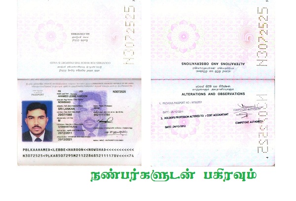 படத்தில் காட்டப்பட்டுள்ள அஹமட்லெப்பை ஹாரூன் நௌசாட் என்ற சம்மாந்துறையைச் சேர்ந்த சகோதரரது கடவுச் சீட்டு கொழும்பில் வைத்து (All Countries) தவறவிடப்பட்டு விட்டது அல்லது தொலைந்து விட்டது.