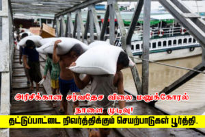 இந்த வகையில் இந்தியாவிலிருந்து ஒரு இலட்சம் மெட்ரிக் தொன் அரிசியை கைத்தொழில், வர்த்தக அமைச்சின் கீழான கூட்டுறவு மொத்த விற்பனை நிலையத்தின் ஊடாக, இலங்கைக்கு தருவிப்பதற்கான நடவடிக்கைகளை அமைச்சர் ரிஷாட் பதியுதீன் மேற்கொண்டிருந்தார்.
