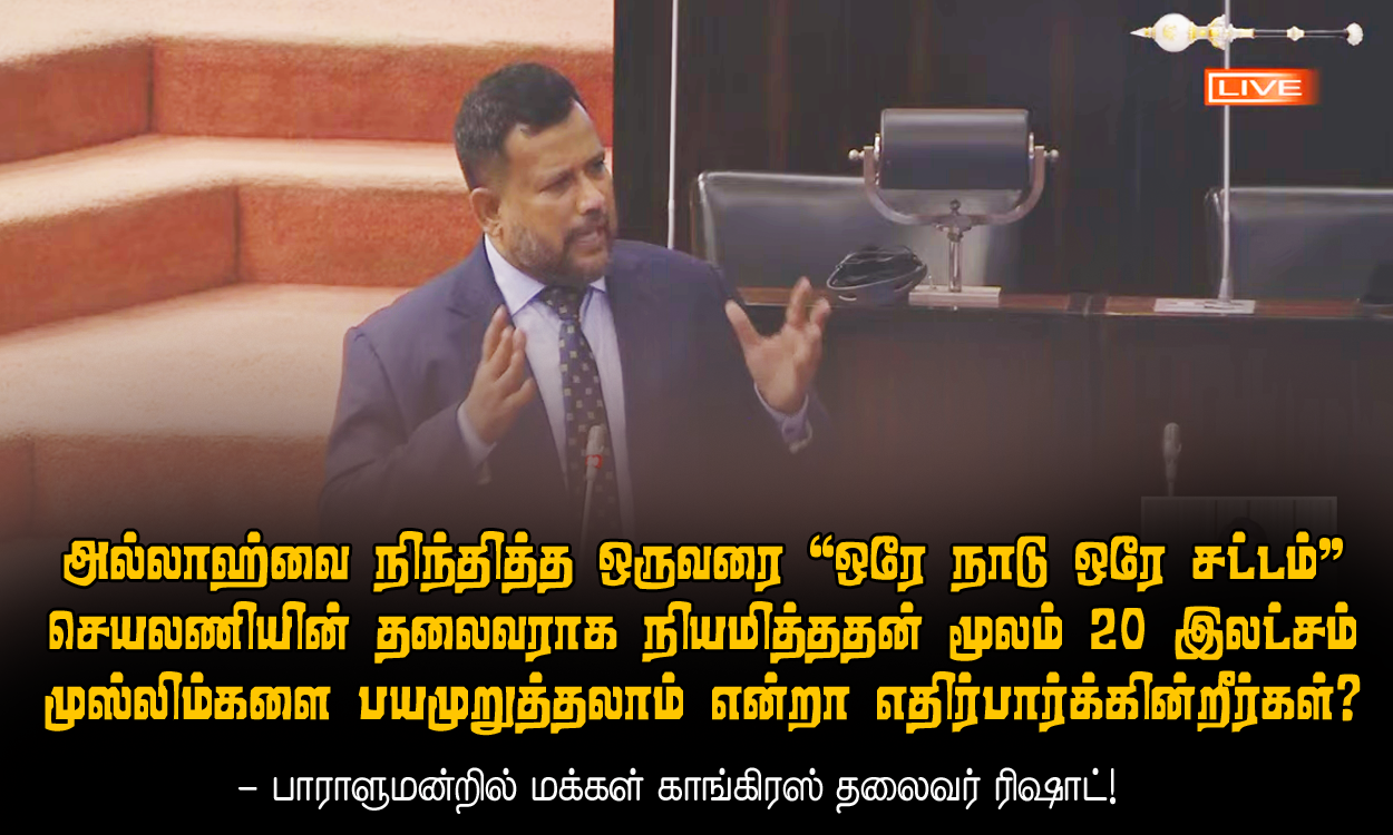 இந்த நாட்டிலே பயங்கரவாதம் உருவெடுத்த போதும், நாட்டிலுள்ள பெரும்பாலானவர்கள் அதனை எதிர்த்து ஒற்றுமையை பேணியதே கடந்தகால வரலாறு. இப்போது அவற்றை எல்லாம் புறந்தள்ளிவிட்டு “ஒரே நாடு ஒரே சட்டம்” என்ற தூரநோக்கு இல்லாத ஒரு கொள்கையை அறிமுகப்படுத்தி, அதுவும், அல்லாஹ்வை மிக மோசமாக கேவலப்படுத்திய  ஒருவரை அதன் தலைவராக ஆக்கியுள்ளீர்கள். உலகின் இரண்டு பில்லியன் முஸ்லிம்கள் வணங்கும் அல்லாஹ்வை, ஈஸ்டர் குண்டுத் தாக்குதலின் பிரதான சூத்திரதாரி எனக் கூறி, அவரை ஏசிய ஒருவரை இவ்வாறு தலைவராக ஆக்கியுள்ளீர்களே. அதுமட்டுமின்றி,  நீதிமன்றத்தினால் தண்டனை வழங்கப்பட்டு, சிறையில் இருந்து பின்னர் ஜனாதிபதி மைத்திரிபாலவினால் மன்னிப்பளிக்கப்பட்ட ஒருவரையே, “ஒரே நாடு ஒரே சட்டம்” என்ற செயலணியின் தலைவராக நியமித்துள்ளீர்கள். இதன் மூலம் நீங்கள் எதனை சாதிக்க நினைக்கின்றீர்கள்?  இந்த நாட்டில் வாழும் இருபது இலட்சம் முஸ்லிம்களை பயமுறுத்தலாம் என்று நினைக்கின்றீர்களா? அல்லது பெரும்பான்மை மக்களை சந்தோஷப்படுத்தலாம் என்று நினைக்கின்றீர்களா? எதிர்மாறாக பெரும்பான்மை சிவில் சமூகம் கூட இதனை எதிர்க்கும் நிலை இன்று வந்துள்ளதே.