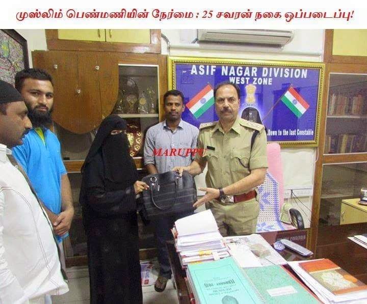 ஹைதராபாதில், நேற்றுமுன்தினம் (02-04-2015), கீழே கண்டெடுத்த 25 சவரன் நகை, உள்ளிட்ட விலை உயர்ந்த பொருட்களை, ஒரு முஸ்லிம் பெண்மணி காவல்துறையில் ஒப்படைத்துள்ளார்.