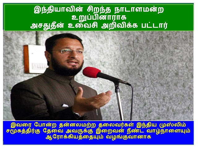 இந்தியாவின் நாடாள மன்றத்திர்கு தேர்ந்து எடுக்க பட்டு செல்லும் பலர் நாடாள மன்றத்தை பொழுது போக்கு கூடமாகவும் சண்டை களமாகவும் மாற்றி வரும் நிலையில் நாடள மன்றத்தை உரிய முறையில் பயன் படுத்திய சிறந்த நாடளமன்ற உறுப்பினராக ஹைதரபாத் சிங்கம் மஜ்லிஸ் கட்சியின் தலைவர் அசதுதீன் உவைசி அறிவிக்கபட்டுள்ளார்