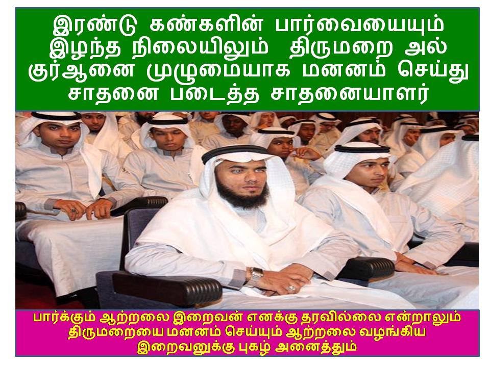 ஆயினும் அதை காரணமாக வைத்து சோம்பேறியாகி முடங்கி விடாமல் தனது அயராத தொடர் முயர்ச்சியினால் திருமறை குர்ஆனின் 30 பகுதிகளையும் திறம்பட மனனம் செய்துள்ள ஹாபிழாக தன்னை மாற்றி சாதனை படைத்துள்ளார்