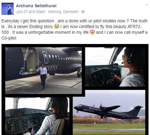 இலங்கையைச் சேர்ந்த தமிழ்ப்பெண்ணான அர்ச்சனா செல்லத்துரை என்பர் டென்மார்க் நாட்டின் முதலாவது தமிழ்ப் பெண் துணை விமானியாக கற்றுமுடித்திருப்பதாக தனது முகப்புத்தகத்தில் கருத்து வெளியிட்டுள்ளார்.