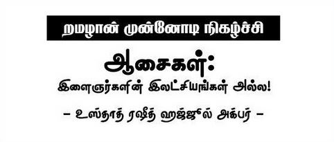இந்நிகழ்வில் உஸ்தாத் ரஷீத் ஹஜ்ஜுல் அக்பர் அவர்கள் ‘ஆசைகள்: இளைஞர்களின் இலக்கு அல்ல!’எனும் தலைப்பில் உரை நிகழ்த்தவுள்ளார். இந்நிகழ்வில் அனைத்து இளைஞர்களும் கலந்துகொண்டு பயன்பெருமாறு அழைக்கிறோம்.