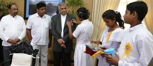 உலக புகைபிடித்தல் எதிா்ப்பு தினத்தையொட்டி பிரதமா் ரணில் விக்கிரகசிங்கவுக்கு பாடாசலை மாணவா்கள் கொடியொன்றை அணிவித்தனா்.