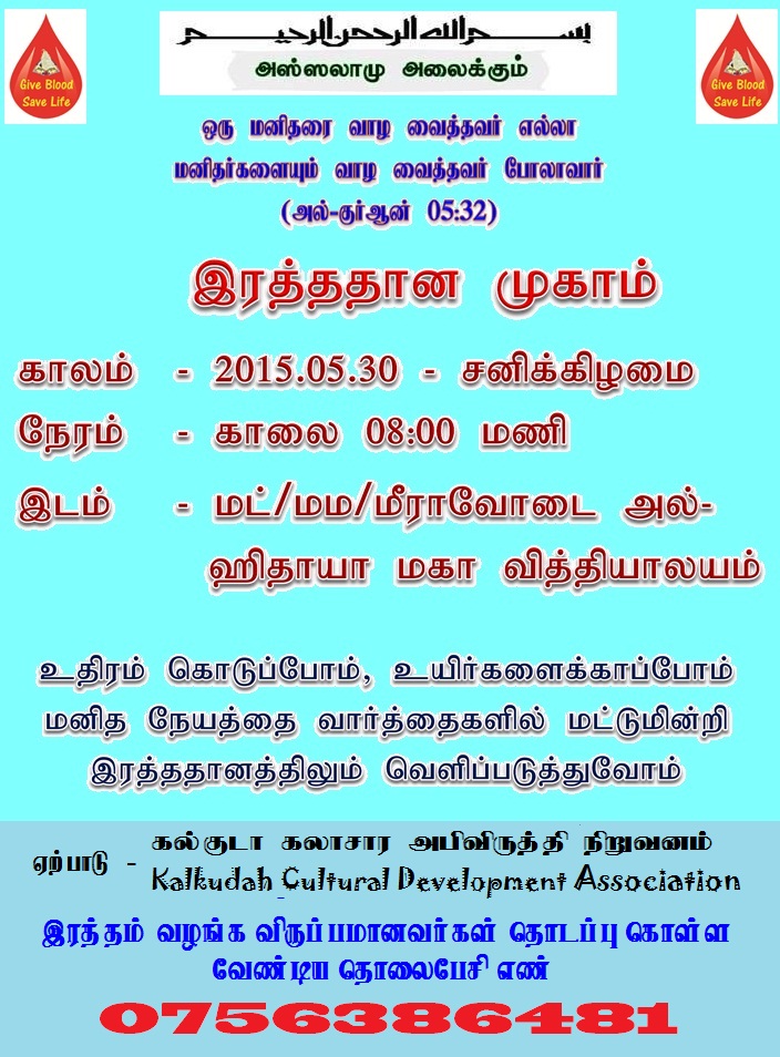கல்குடா கலாசார அபிவிருத்தி நிறுவனத்தின் ஏற்பாட்டில் மீராவோடை அல்-ஹிதாயா மகா வித்தியாலயத்தில் எதிர்வரும் 30.05.2015 சனிக்கிழமை இரத்ததான முகாம் ஒன்று ஏற்பாடு செய்யப்பட்டுள்ளது.