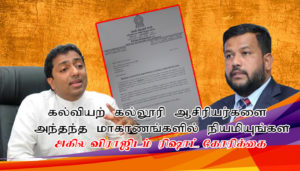 புதிதாக நியமனம் பெற்றுள்ள ஆசிரியர்கள் வதியும் மாகாணங்களில் ஆசிரியர் வெற்றிடங்கள் இருக்கும் நிலையில், வேறு மாகாணங்களுக்கு கல்வியற் கல்லூரி ஆசிரியர்களை நியமித்துள்ளமையை உடனடியாக இரத்துச் செய்து, அந்தந்த மாகாணங்களிலுள்ள வெற்றிடங்களுக்கு அவர்களை நியமிக்குமாறு அவர் வலியுறுத்தியுள்ளார்.
