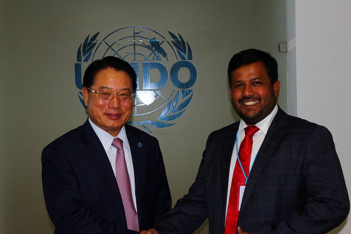 ஐக்கிய நாடுகள் கைத்தொழில் அபிவிருத்தி அமைப்பு ஏற்பாடு செய்த கைத்தொழில் அபிவிருத்தி மாநாட்டில் கைத்தொழில் மற்றும் வர்த்தக அமைச்சர் றிஷாத் பதியுதீன் மற்றும் ஐக்கிய நாடுகள் கைத்தொழில் அபிவிருத்தி அமைப்பின் பணிப்பாளர் நாயகநாயகம் லி-யோங் ஆகியோர் சந்தித்து கைகுலுக்குவதை படத்தில் காணலாம். (NOV 5)