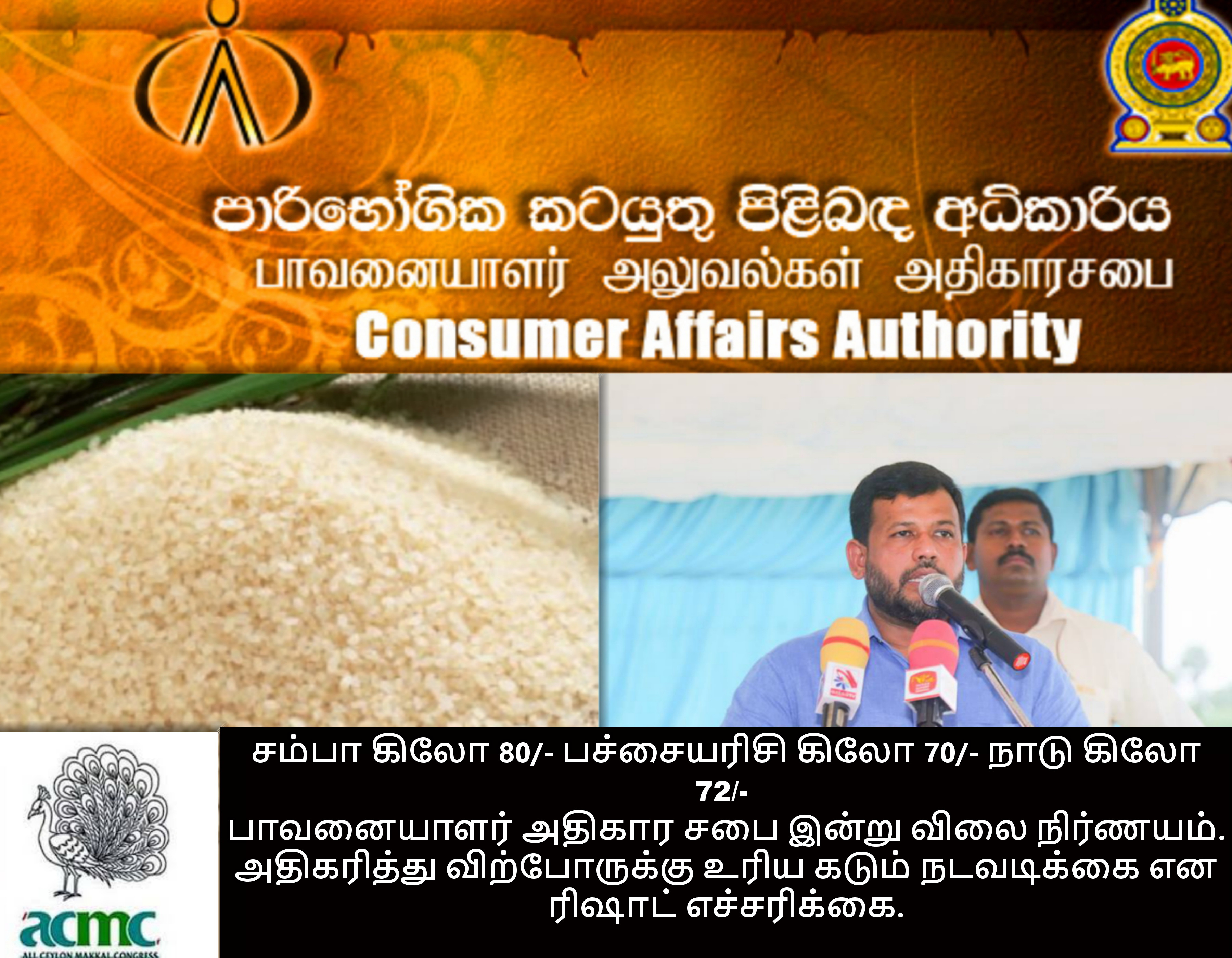 பாவனையாளர் அதிகார சபையின் 2003 சட்டத்தின், இலக்கம் 9, பிரிவு 20,05 இன் கீழான கட்டளைக்கிணங்க பாவனையாளர் அதிகார சபையின் தலைவர் ஹசித திலகரத்ன இன்று (8) அரிசி ஆகக் கூடிய சில்லறை விலை தொடர்பான அறிவித்தலை வெளியிட்டுள்ளார். இதற்கான வர்த்தமானிப் பிரகடனத்தை வெளிவிடுவதற்கான நடவடிக்கையும் மேற்கொள்ளப்பட்டது.
