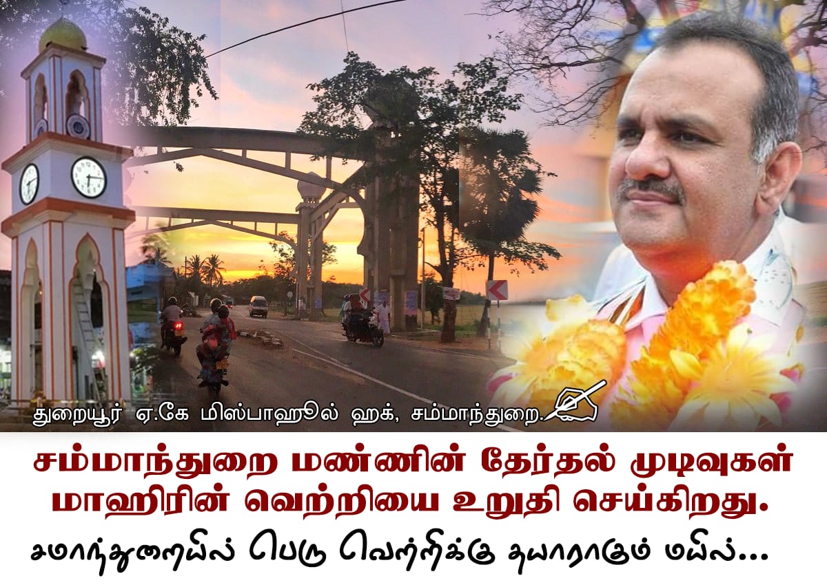 இம் முறை மு.மா.ச உறுப்பினர் மாஹிர் மயிலில் களம் கண்டுள்ளார். மாஹிரின் தனிப்பட்ட செல்வாக்கும், சம்மாந்துறையில் மயிலுக்குமுள்ள செல்வாக்கும் சேர்ந்து சம்மாந்துறையில் மயில் தோகை விரித்தாடப் போகிறது என்பதில் ஐயமில்லை. இது நான் சொல்லவில்லை. சம்மாந்துறை மண்ணின் தேர்தல் முடிவுகள் அப்படித்தான் சொல்லியுள்ளன.