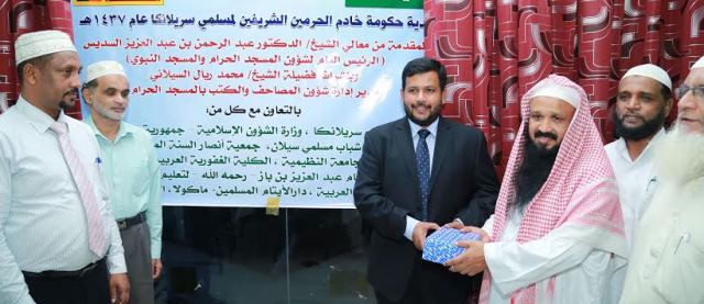 சவூதி அரேபிய அரசாங்கத்திடமிருந்து அன்பளிப்பாக பெறப்பட்ட சுமார் 30,000 அல்குர்ஆன் மற்றும் பெறுமதி வாய்ந்த கிதாபுகள் இலங்கையில் உள்ள மத்ரஸாக்கள், அநாதை நிலையங்கள் மற்றும் முஸ்லிம் நிறுவனங்களுக்கு வினியோகிக்கும் நிகழ்வு 20/10/2015 ஜம்ய்யதுஸ் ஸபாப் நிறுவன கேட்போர் கூடத்தில் மொளலவி எம்.எஸ்.எம் தாஸிம் தலைமையில் இடம் பெற்றது.