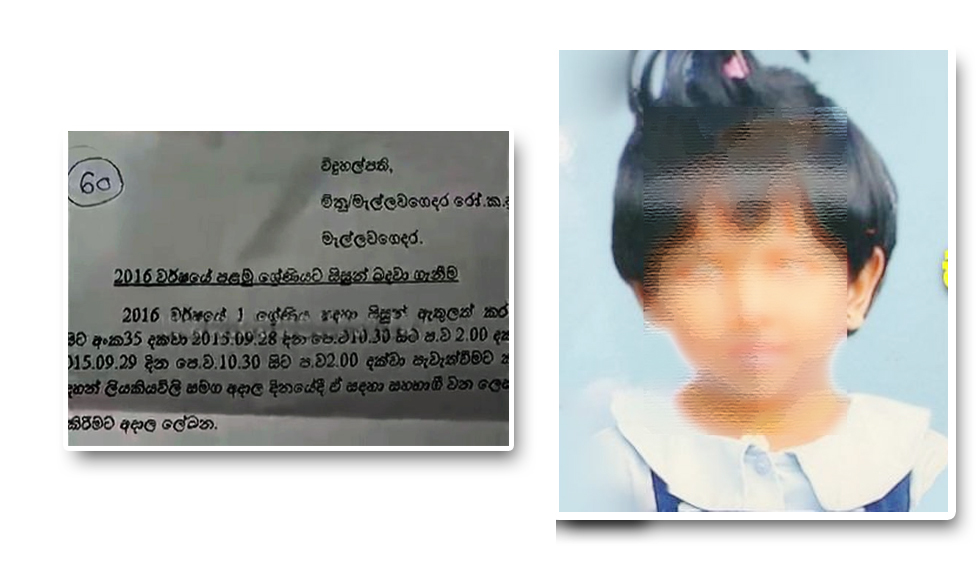 கழுத்து நெரிக்கப்பட்டு பாலியல் துஷ்பிரயோகத்துக்கு உட்படுத்தப்பட்டு கொலை செய்யப்பட்ட கொட்டதெனியாவ – படல்கம, அக்கரங்கஹ பகுதியைச் சேர்ந்த சேயா செதவ்மி என்ற ஐந்து வயதுடைய சிறுமியை 2016 ஆம் ஆண்டு முதலாம் தர வகுப்பில் இணைத்து கொள்வதற்கான நேர்முகப் பரீட்சை அழைப்பு கடிதம் கிடைக்கப்பெற்றுள்ளதாக தெரிவிக்கப்படுகின்றது.
