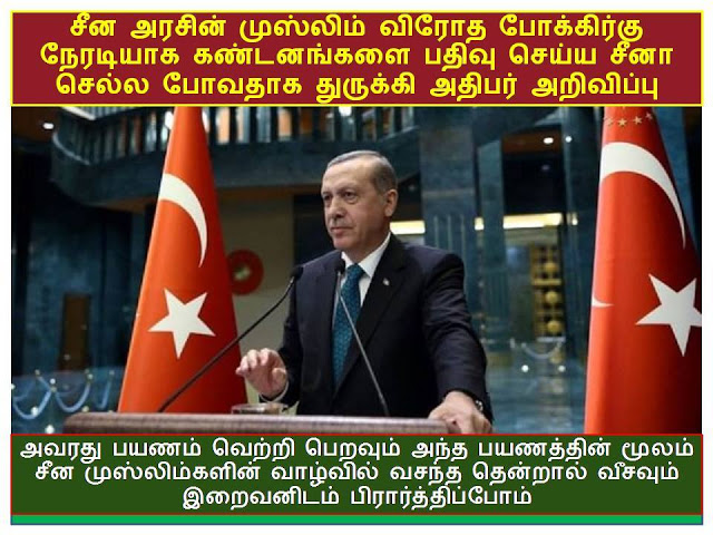 நோன்பு வைப்பதற்கு தடை உள்ளிடட்ட பல்வேவறு பிரச்சனைகள் மூலம் சீனா முஸ்லிம்களை அச்சுறுத்தி வரும் சீனவின் அத்து மீறல் குறித்து சீன அதிகாரிகளிடம் நேரடியாக விவாதிப்பதர்காகவும் சீன முஸ்லிம்களை சந்தித்து ஆறுதல் கூறுவதர்காகவும் எதிர் வரும் 28 திகதி சீன செல்ல போவதாக துருக்கி அதிபர் ரஜப் எர்துகான் அறிவித்துள்ளார்