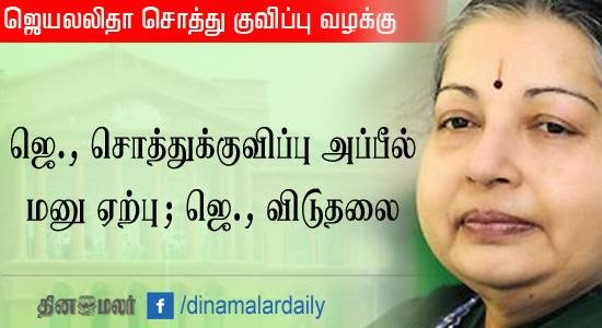 1991-96 காலக்கட்டத்தில் தமிழக முதல்வராக இருந்த ஜெயலலிதா மற்றும் சசிகலா, சுதாகரன், இளவரசி ஆகியோர் வருமானத்துக்கு அதிகமாக ரூ.66.65 கோடி சொத்துக் குவித்ததாக வழக்கு தொடரப்பட்டது. 18 ஆண்டுகளாக நடைபெற்ற இவ்வழக்கை விசாரித்த பெங்களூரு சிறப்பு நீதிமன்ற நீதிபதி ஜான் மைக்கேல் டி’குன்ஹா கடந்த செப்டம்பர் 27-ம் தேதி நால்வருக்கும் தலா 4 ஆண்டு சிறைத் தண்டனை விதித்தார். மேலும் ஜெயலலிதாவுக்கு ரூ.100 கோடி அபராதமும் மற்ற மூவருக்கும் தலா ரூ. 10 கோடி அபராதமும் விதித்து உத்தரவிட்டார்.