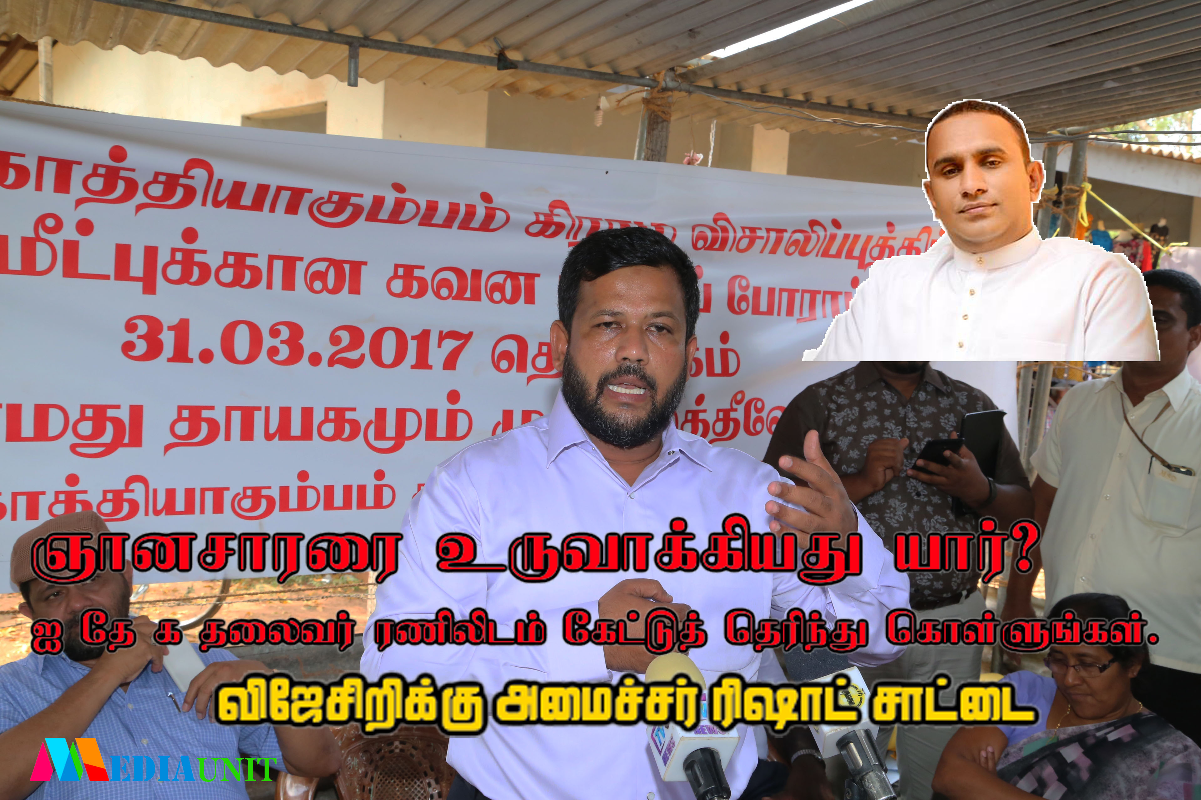 வில்பத்தை யார் அழித்தார்கள்? ஞானசாரரை யார் உருவாக்கினார்கள் என்ற விடயங்களை உங்கள் தலைவரிடம் நீங்கள் கேட்டுத்தெரிந்த பின்னர் அவை பற்றி பேசுங்கள். இந்த விடயங்களை நீங்கள், நீங்களாகவே பேசவில்லை. உங்களை யாரோ பேச வைத்திருக்கின்றார்கள் என்றும் அமைச்சர் தெரிவித்தார்.