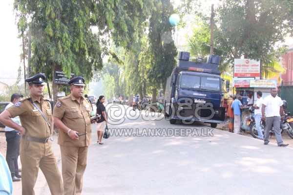 நீதிமன்றத்தை அவமதித்தார் என்ற குற்றச்சாட்டின் பேரில் கைதுசெய்யப்பட்டு விளக்கமறியலில் வைக்கப்பட்டுள்ள பொதுபல சேனா அமைப்பின் பொதுச்செயலாளர் கலகொடஅத்தே ஞானசார தேரர், ஹோமாகம நீதவான் நீதிமன்றத்தில் ஆஜர்படுத்தப்படவுள்ளார். நீதிமன்றத்துக்கு அண்மையில் உள்ள இரண்டு வீதிகள், இரும்பு கம்பிகளான தடைகள் போட்டு மறிக்கப்பட்டுள்ளன. வழக்கு விசாரணைக்களுக்கு வருகைதந்தவர்களை தவிர, வேறு எவரும் நீதிமன்ற வளாகத்துக்குள் அனுமதிக்கப்படவில்லை. தண்ணீர் பீச்சியடிக்கும் வாகனம் தயாராக வைக்கப்பட்டுள்ளதுடன் கலகம் அடக்கும் பொலிஸாரும் உஷாராக வைக்கப்பட்டுள்ளனர். பட உதவி: லங்காதீப