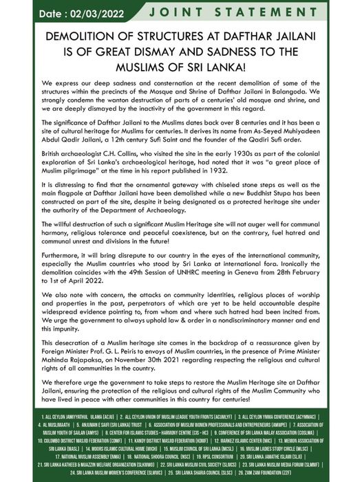 மத வழிபாட்டுத்தலங்கள் குறிப்பாக, வரலாற்று சிறப்புமிக்க இடங்கள் இவ்வாறு இடித்து அழிக்கப்படுவதை நாம் வன்மையாகக் கண்டிக்கின்றோம். அத்துடன், தஃப்தர் ஜெய்லானி பள்ளிவாசலை அழிக்க முயன்றவர்களைக் கண்டறிந்து, கைது செய்ய அரசு துரித நடவடிக்கை எடுக்கும் எனவும் நம்புகின்றோம்.