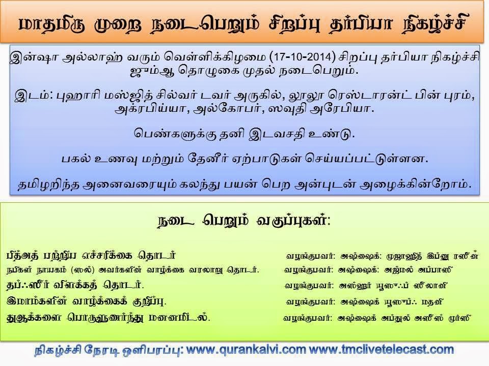 இன்ஷா அல்லாஹ் வரும் வெள்ளிக்கிழமை (17.10.2014) நடபெறும் தர்பியா நிகழ்ச்சிக்கான அழைப்பிதல் இத்துடன் இணைக்கப்பட்டுள்ளது.