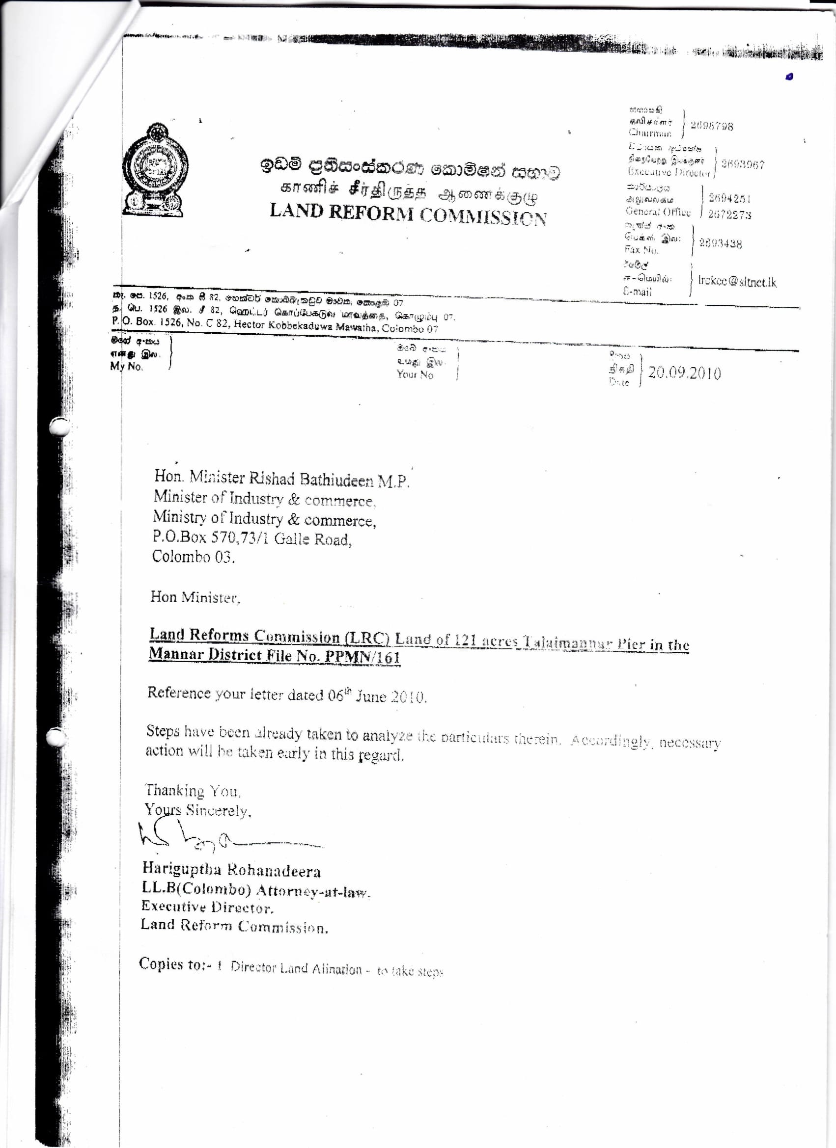 இதேவேளை, இந்தக் காணி உரிமங்களைப் பெற்றுக்கொள்வதற்காக அமைச்சர் ரிஷாட் பதியுதீன் 2010/ 06/ 23 ஆம் திகதியும், 2011/ 02/ 10 ஆம் திகதியும் காணிச் சீர்திருத்த ஆணைக்குழுவின் தலைவர் நிமல் புஞ்சி ஹேவாவுக்கு எழுத்துமூல கடிதம் ஒன்றை சமர்ப்பித்திருந்தமையும், அதன் பின்னர், வடமாகாண மீள்குடியேற்றத்துக்கான ஜனாதிபதி செயலணியிடமும் கோரிக்கை ஒன்றை சமர்ப்பித்திருந்தமை குறிப்பிடத்தக்கது. அந்தச் செயலணி காணிச் சீர்திருத்த ஆணைக்குழுவின் தலைவருக்கு இதனை வழங்க நடவடிக்கை எடுக்குமாறும் முன்னர் வலியுறுத்தி இருந்தது.