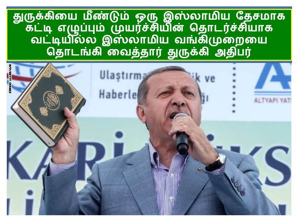 இந்த முயர்ச்சியின் தொடர்ச்சியாகதான் துருக்கி முழுவதும் இஸ்லாமிய வங்கி நடவடிக்கைகளை செயல் படுத்துவதர்கு முன்னோட்டமாக துருக்கியின் இஸ்தான்புல் நகரில் முதல் வட்டியில்லா இஸ்லாமிய வங்கிமுறையை துருக்கி அதிபர் தொடங்கி வைத்தார்