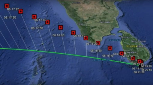 காலிக்கும் ஹம்பாந்தோட்டைக்கும் இடைப்பட்ட கடல்பகுதியிலேயே இந்த மர்மப்பொருள் வீழும் என்று கூறப்படுகிறது.