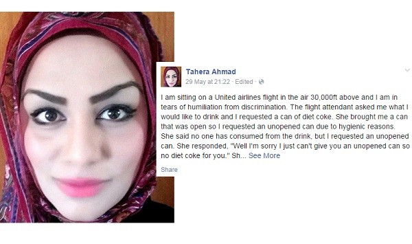 தாஹிரா அஹ்மத் என்ற முஸ்லிம் பெண்மணி நேற்று முன்தினம் (29-05-2015) அமெரிக்க விமானத்தில் பயணம் மேற்கொண்டுள்ளார்.