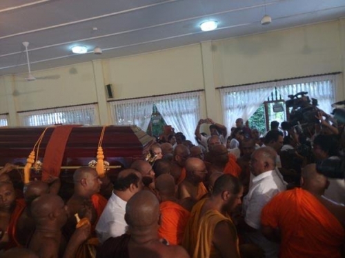 பெருந்திரளான மக்களின் துயர கண்ணீருடன் அன்னாரை சுமந்த பேழை விஹாரையிலிருந்து வெளியில் கொண்டு வரப்பட்டுள்ளது.