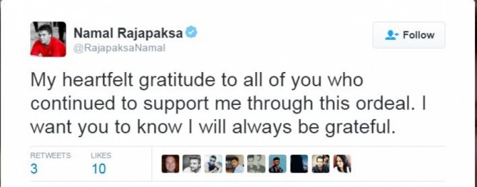நிதி மோசடி தொடர்பில் கைது செய்யப்பட்டு சற்று முன்னர் பிணையில் விடுதலை செய்யப்பட்ட நாமல் ராஜபக்ஸ தனது டுவிட்டர் கணக்கில் கருத்துப் பதிவேற்றம் செய்துள்ளார்.