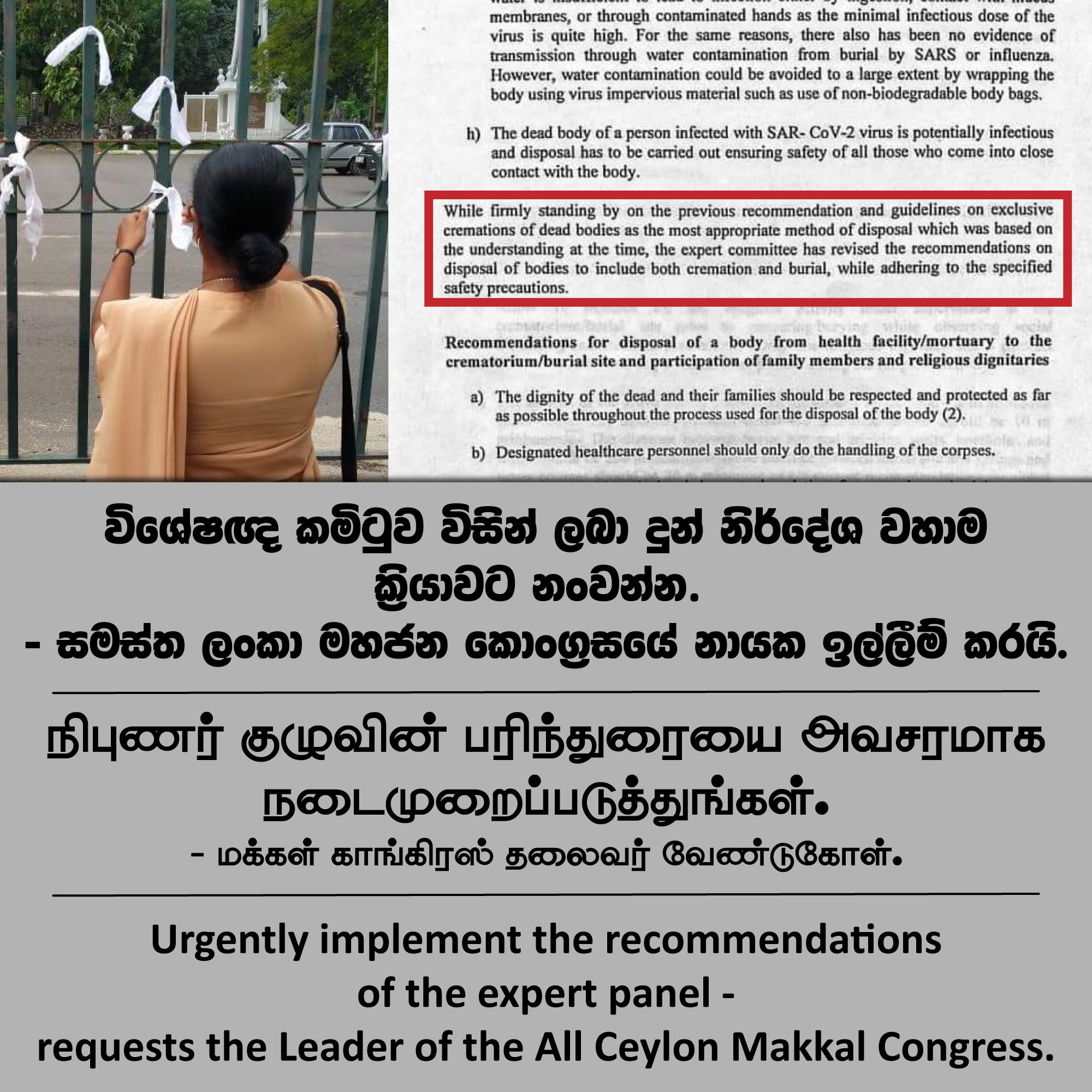 கொவிட் 19 தொற்றினால் இறந்த உடல்கள் சம்பந்தமாக புதிதாக நியமிக்கப்பட்ட நிபுணர் குழுவின் பரிந்துரையை உடனடியாக நடைமுறைப்படுத்துமாறு அகில இலங்கை மக்கள் காங்கிரஸ் தலைவரும் பாராளுமன்ற உறுப்பினருமான ரிஷாட் பதியுதீன் அரசாங்கத்திடம் வேண்டுகோள் விடுத்துள்ளார்.