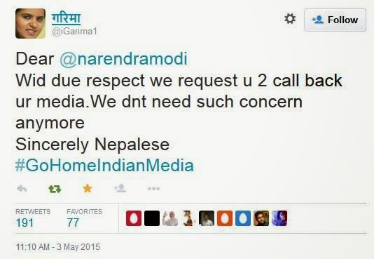 இந்திய பத்திரிகையாளர்களுக்கு எதிராக, “உங்கள் நாட்டிற்கு திரும்பி போங்கள்” என்று ஹேஷ்டேகை நேற்று உருவாக்கி டுவிட்டரில் ஒரு லட்சம் டுவிட்டுகளை பதிவு செய்துள்ளார்கள் நேபாள மற்றும் இந்தியாவை சேர்ந்தவர்கள்.