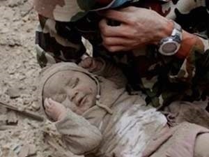 அப்போது, ஒரு ராணுவ வீரரின் காதுகளில் மட்டும் சிறு குழந்தையின் மெல்லிய அழுகுரல் சத்தம் லேசாக விழுந்தது. சத்தம் வந்த இடத்துக்கு விரைந்து சென்றபோது, சற்று நேரத்துக்கு முன்னர் இறந்து விட்டதாக கருதிய குழந்தை இன்னும் உயிருடன் இருப்பதை அறிந்துகொண்ட அவர், அருகாமையில் இருந்த சக வீரர்களை உதவிக்கு அழைத்தார்.