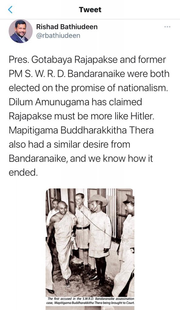 “ஜனாதிபதி கோட்டாபய ராஜபக்ஷ ஹிட்லரை போன்று ஆட்சியை முன்னெடுக்க வேண்டும் என்பதே, அவருக்கு வாக்களித்த 69 இலட்சம் மக்களின் எதிர்பார்ப்பு” என இராஜாங்க அமைச்சர் திலும் அமுனுகம அண்மையில் வெளியிட்ட கருத்து தொடர்பில், அகில இலங்கை மக்கள் காங்கிரஸ் தலைவரும் பாராளுமன்ற உறுப்பினருமான ரிஷாட் பதியுதீன் டுவிட்டர் பதிவொன்றை பதிவிட்டுள்ளார்.