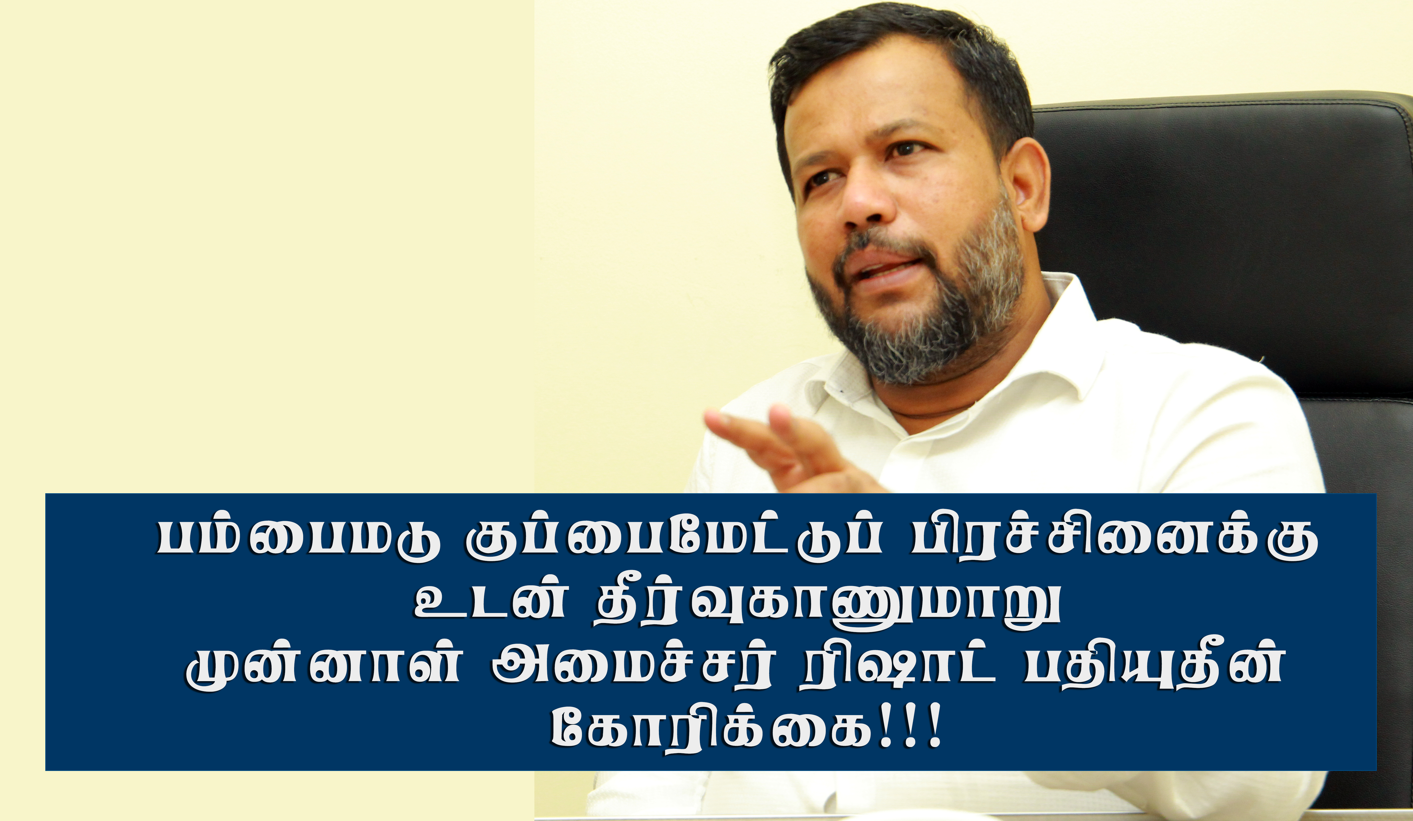 வவுனியா, பம்பைமடு குப்பைமேட்டுப் பிரச்சினைக்கு அவசரமாகத் தீர்வுகண்டு, சாளம்பைக்குளம் உட்பட சுற்றுச்சூழவுள்ள பிரதேசங்களில் வாழ்கின்ற மக்களின் சுக வாழ்வுக்கு நடவடிக்கை எடுக்குமாறு, அகில இலங்கை மக்கள் காங்கிரஸ் தலைவரும் பாராளுமன்ற உறுப்பினருமான ரிஷாட் பதியுதீன் வேண்டுகோள் விடுத்துள்ளார்.