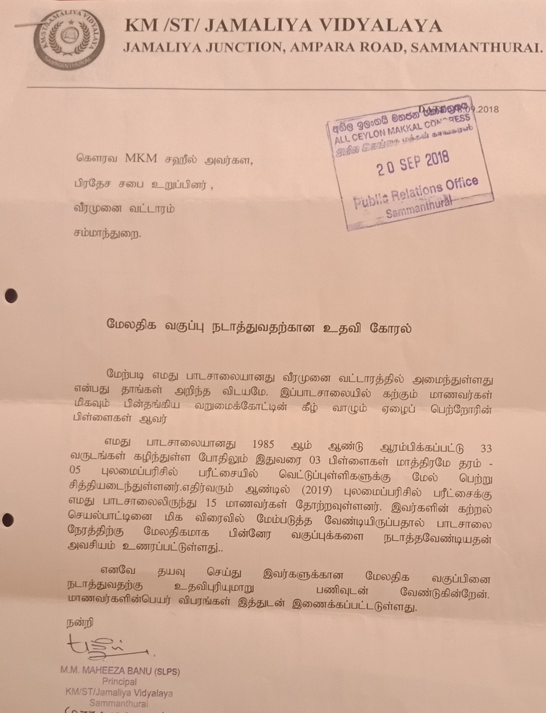 சம்மாந்துறை பிரதேசத்தின் வறிய குடும்பங்களை உள்ளடக்கிய சது/ஜமாலியா வித்தியாலயத்தின் நிலவரத்தினை அகில இலங்கை மக்கள் காங்கிரஸின் சம்மாந்துறை பிரதேச சபையின் உறுப்பினர் ஏ.சீ.எம்.சஹீலிடம் பாடசாலை நிருவாகத்தினர் அண்மையில் சுட்டிக்காட்டியிருந்தனர்.