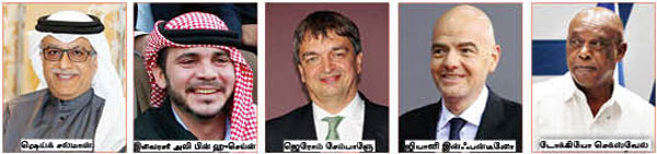 வேட்பாளர்கள் ஜியானி இன்ஃபன்டீனோ (45 வயது, சுவிட்ஸர்லாந்து, ஐரோப்பிய கால்பந்தாட்ட சங்கங்களின் ஒன்றிய பொதுச் செயலாளர்),டோக்கியோ செக்ஸ்வேல் (62 வயது, தென் ஆபிரிக்கா, ஃபீஃபா பாகுபாட்டுக்கு எதிரான நடவடிக்கை படை), ஜெரோம் சேம்பாஞே (57 வயது, பிரான்ஸ், ஃபீஃபாவின் முன்னாள் செயலாளர்நாயகம்),இளவரசர் அலி பின் ஹுசெய்ன் (40 வயது, ஜோர்தான், ஃபீஃபாவின் முன்னாள் உதவித் தலைவர், தலைவர் பதவிக்கான முன்னாள் வேட்பாளர்), ஷெய்க் சல்மான் பின் இப்ராஹிம் அல் காலிஃபா (50 வயது, பாஹ்ரெய்ன், ஃபீஃபா உதவித் தலைவர், ஆசிய கால்பந்தாட்ட கூட்டுசம்மேளனத் தலைவர்)