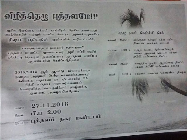 *காலை 9.00 மணிக்கு புத்தளம் 6ம் கட்டை (இஸ்மாயில் புரம்) பாதைக்கு அடிக்கல் வைத்தலும் கட்சி காரியாலயம் திறப்பு விழாவும் .