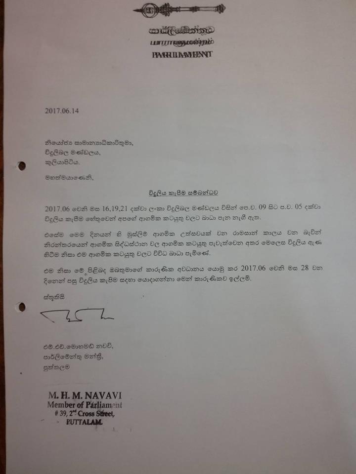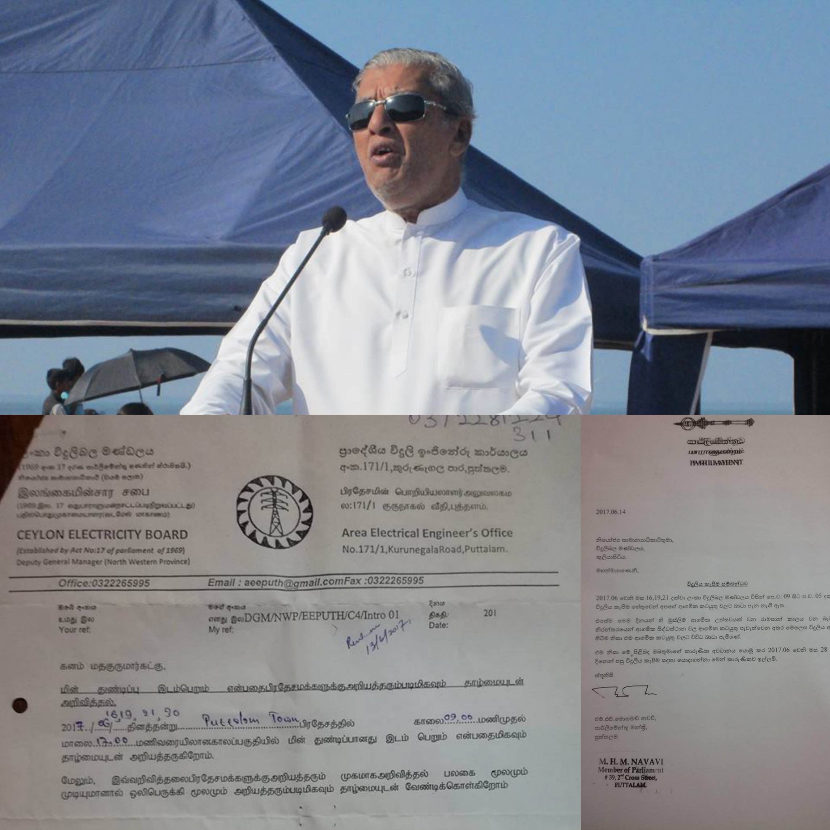 புனித நோன்பு பெருநாள் காலப்பகுதியில் இது எமது மக்களை சிரமப்படுத்தும் என்பதால் எமது பாராளுமன்ற உறுப்பினரும், அகில இலங்கை மக்கள் காங்கிரஸின் பிரதித் தலைவருமான கெளரவ அல்ஹாஜ் எம்.எச்.எம். நவவி அவர்கள் புத்தளம் மாவட்ட மின்சார சபை பிரதி பொது முகாமையாளருடன் இது தொடர்பாக பேசி இம்மாதம் முழுவதும் மின்சாரம் துண்டிக்கப்படுவதை இடைநிறுத்தியுள்ளார்.