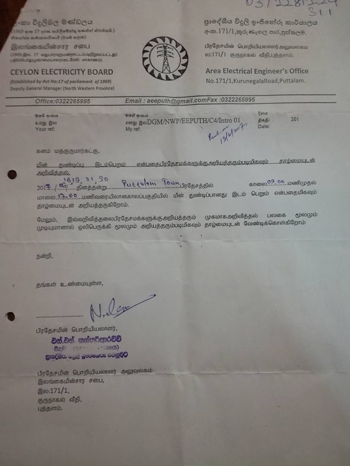 கடந்த சில தினங்களாக புத்தளம் நகர் பகுதியில் பகல் பொழுதுகளில் மின்சாரம் துண்டிக்கப்பட்டு திருத்த வேலைகள் மேற்கொள்ளப்பட்டன. இது எமது புனித ரமழான் மாதத்தில் எம்மக்களுக்கு மிகுத்த அசௌகரியத்தை அளித்தது. இந்நிலையில் இதன் தொடர்ச்சியாக எதிர்வரும் 21 ம் திகதி தொடக்கம் 30 ம் திகதிக்கு இடைப்பட்ட சில நாட்களிலும் மின் வெட்டு அமுல்படுத்தப்படும் என்று அறிவிக்கப்பட்டிருந்தது.