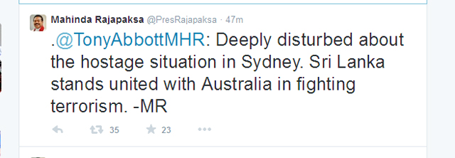 அவுஸ்திரேலிய சிட்னி நகரத்தில் 20 பொது மக்களை ஆயுதம் தாங்கிய தீவிரவாதிகளால் சிறைபிடித்து வைத்துள்ள சம்பவம் தொடர்பில் ஜனாதிபதி மகிந்த ராஜபக்ச கவலை வெளியிட்டுள்ளார்.