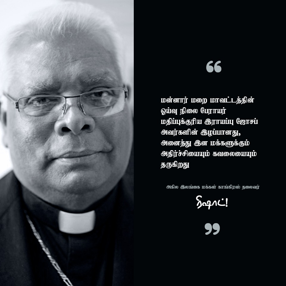 “மன்னார் மறை மாவட்டத்தின் ஓய்வு நிலை பேராயர் மதிப்புக்குரிய இராயப்பு ஜோசப் அவர்களின் இழப்பானது, அனைத்து இன மக்களுக்கும் அதிர்ச்சியையும் கவலையையும் தருகிறது.