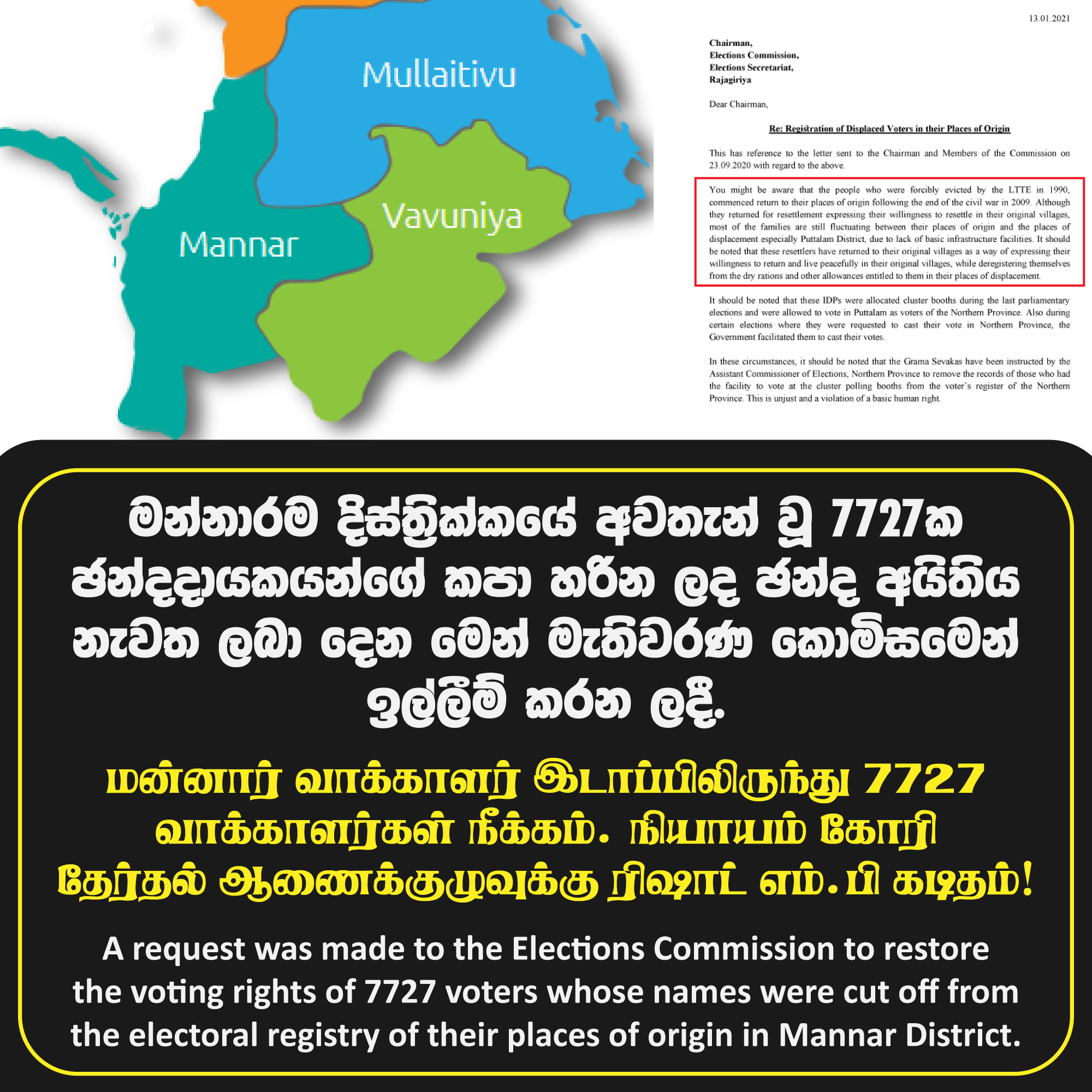 எனவே, மன்னார் மாவட்ட உதவித் தேர்தல் ஆணையாளரால் வாக்களிப்பதற்கு தடுக்கப்பட்ட 7727 வாக்காளர்களையும், அவர்களது சொந்த மாவட்ட வாக்காளர் இடாப்பில் மீளப் பதிவு செய்து, அவர்களுக்கு வாக்களிக்கும் உரிமையை வழங்க வேண்டும்.