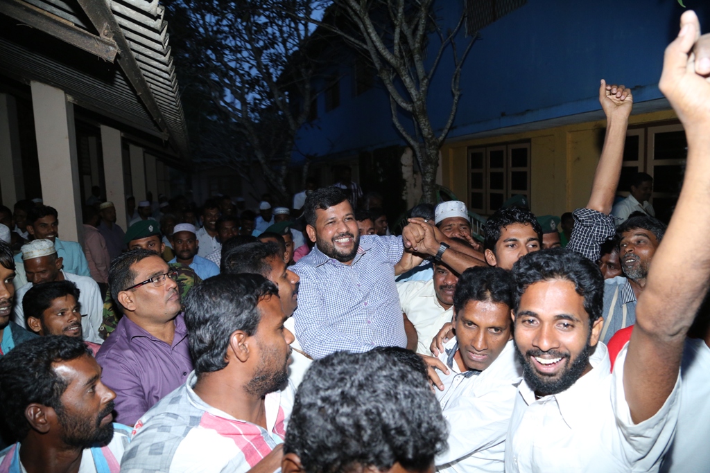 இதனை அடுத்து மேடையிலிருந்து இறங்கமுற்பட்ட அமைச்சரை சூழ்ந்து கொண்ட வவுனியா மாவட்ட முஸ்லிம் இளைஞர்கள் தமது தோளில் அமைச்சரை சுமந்து கூட்ட மண்டபத்திலிருந்து சூடுவெந்தபுளவு மகாவித்தியாலய முன்றல் வரை ஊர்வலமாக நாரே தக்பீர் கோசத்துடன் அழைத்துச் சென்றனர்