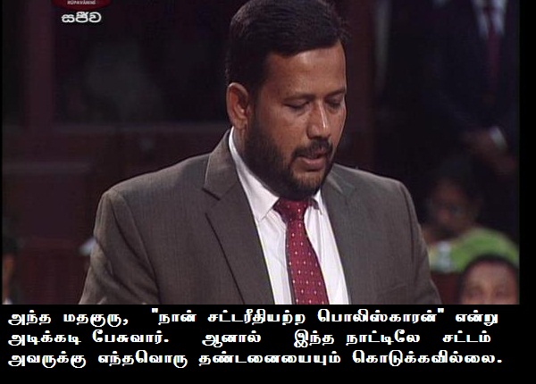 அந்த மதகுரு,  “நான் சட்டரீதியற்ற பொலிஸ்காரன்என்று அடிக்கடிபேசுவார்.  ஆனால்   இந்த நாட்டிலே  சட்டம் அவருக்கு எந்தவொருதண்டனையையும்கொடுக்கவில்லை அவருடைய அந்தக்கொட்டத்தை அடக்குவதற்கு அரசாங்கம்எந்தவொருநடவடிக்கையையும் எடுக்கவில்லை.